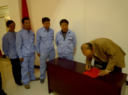 動員大會上各級領(lǐng)導(dǎo)、各車間管理干部、車間班組長上臺進(jìn)行“百日安全大練兵”活動簽字儀式。